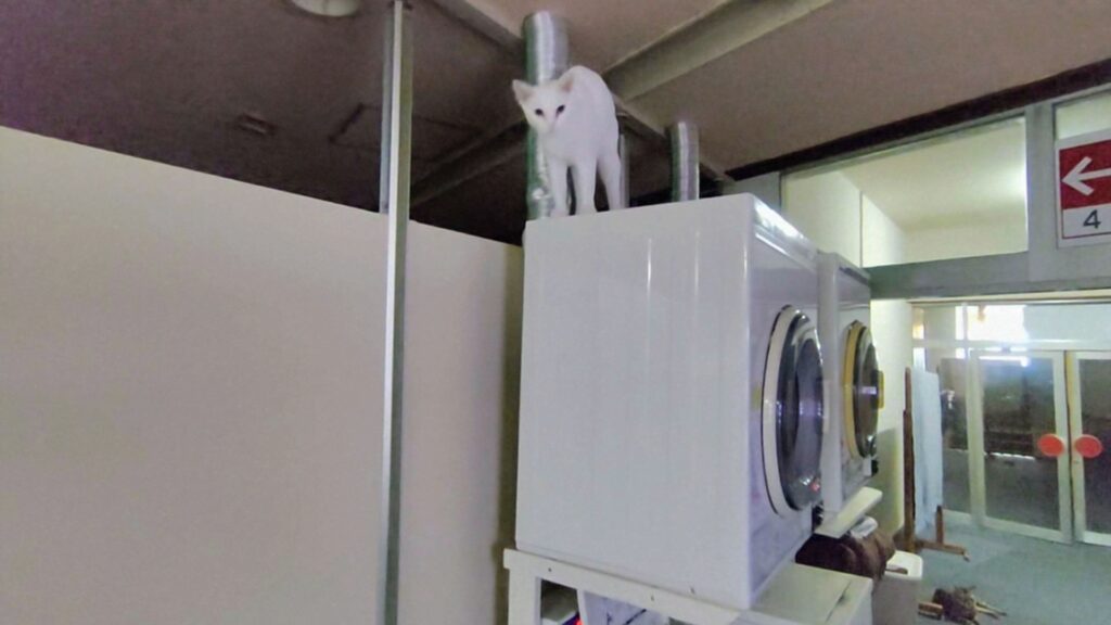 風呂上がり部屋に帰る途中のコインランドリーを通る時、猫の泣き声がしました。見上げると猫がコインランドリーの上にいます。