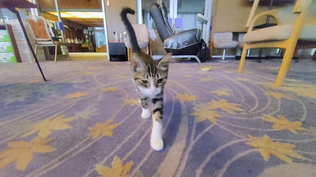 保護猫40匹が暮らすホテル、徳島のホテル白い燈台。2回目のフリアコで訪れた時、子猫のうにちゃんが挨拶に来ました。