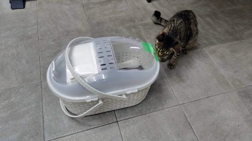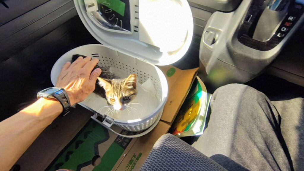 子猫はペット用のキャリーに入れて車に乗せます。移動中は子猫の負担を減らすため、1時間に1回の休憩を挟みました。