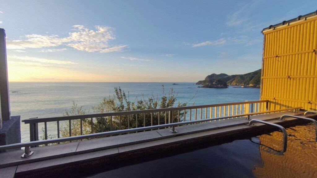 ホテル滞在中は毎朝が露天風呂で始まります。太平洋が見渡せるオーシャンビュー。こんなに見晴らしの良いホテルは中々ありません。