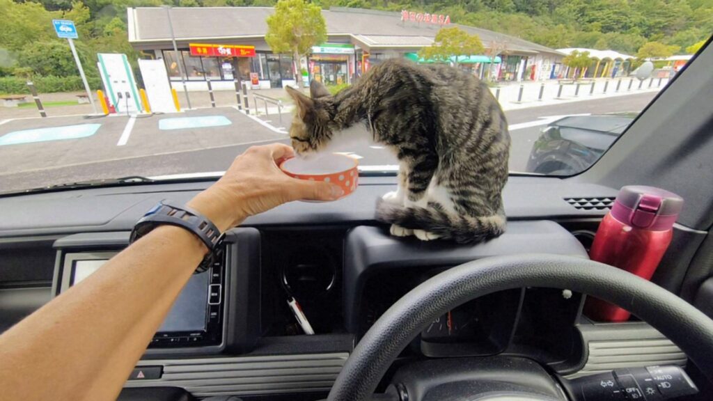 サービスエリアで休憩です。この時季、車内は暑くなるので子猫の水分補給も忘れません。