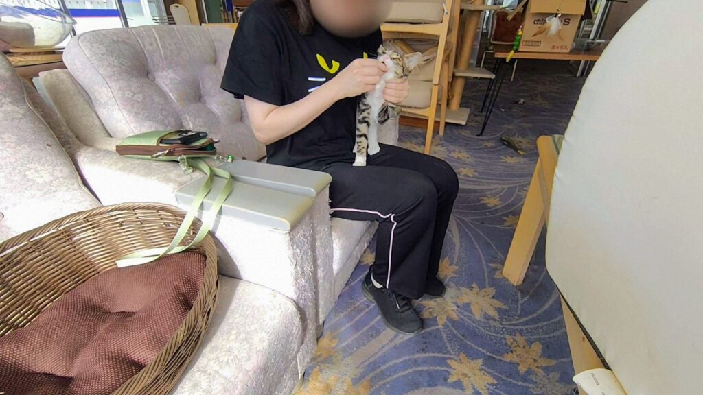 子猫のうにちゃんはお腹の調子が悪く一日2回、薬を飲ませます。私が苦労して飲ませてると、フリアコの女性が代わりをしてくれました。子猫の薬の飲ませ方が上手です。