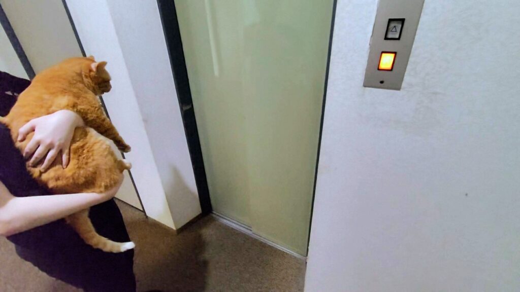 お客様から内線がありました。客室フロアーに猫がいるようです。フリアコのかたと駆けつけました。猫の回収もこのホテルでは仕事です…笑