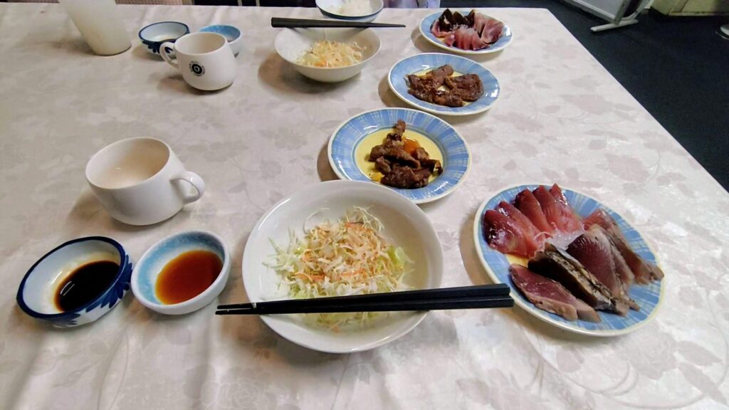 夜の調理が終わり、これから夕食です。今日の賄いは刺身が多くて嬉しいです。