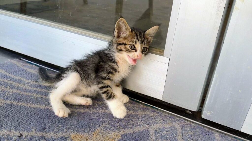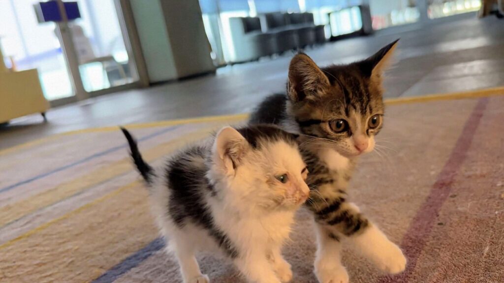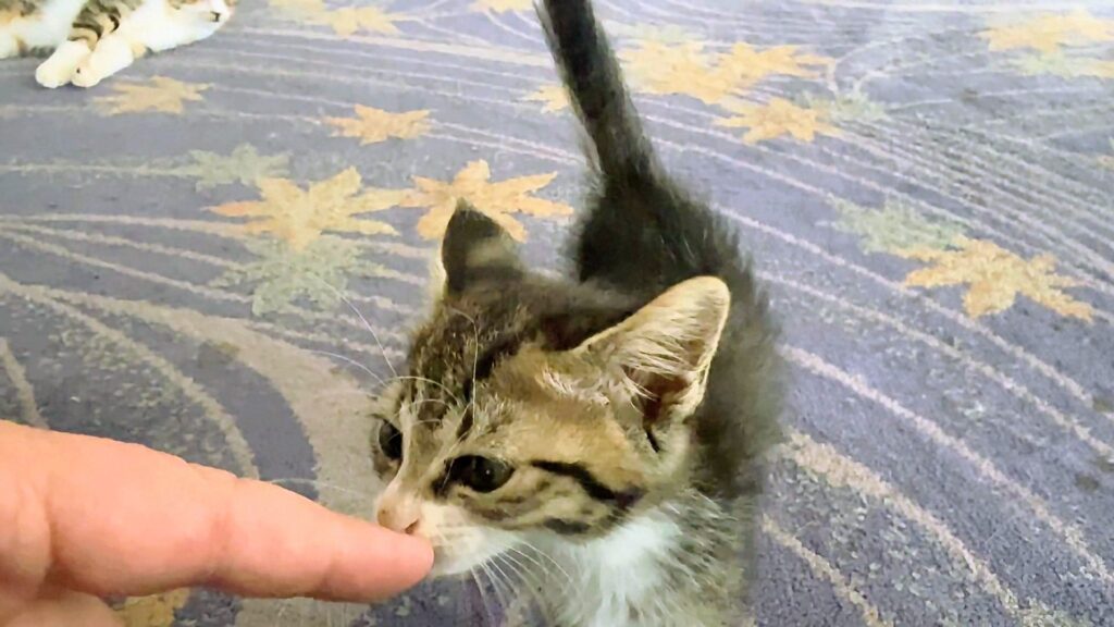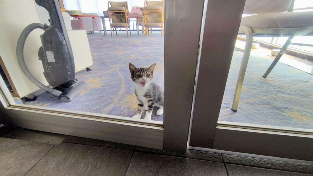 年齢的に子猫を飼えない老夫婦、ホテルに相談に来ます。保護された時はかすれた声で泣いてました。助けを求めて叫び続けていたのでしょう…