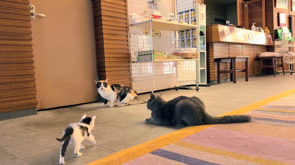 ある日ホテルのロビーで猫の唸り声が響き、うにがビックリしました。猫同士のケンカです。小雪ちゃんが2匹の猫の間に入ります。