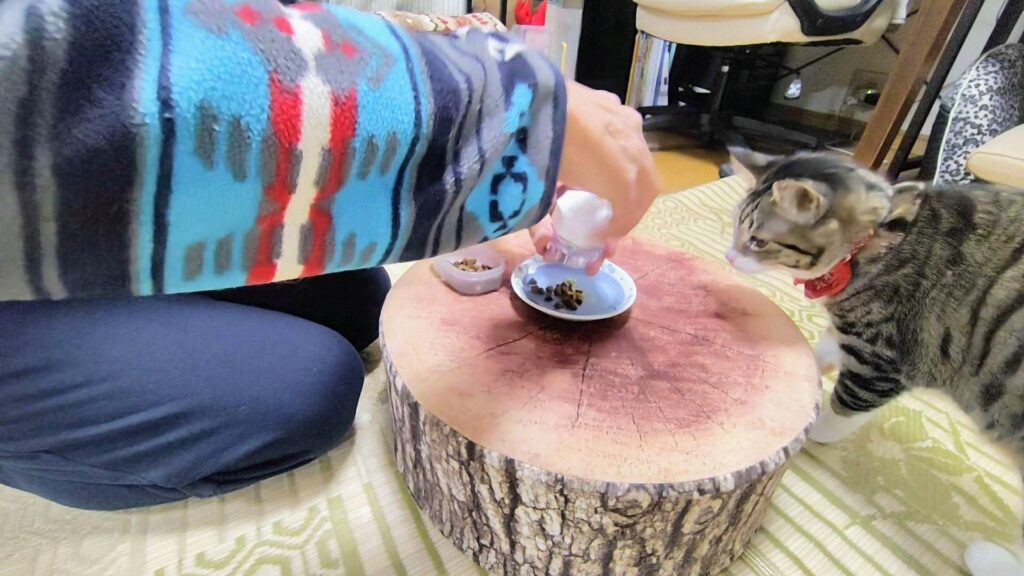 わが家の朝は猫たちのご飯の催促で始まります。お腹の調子が悪く通院中のうに。お薬クラッシャーで錠剤を砕き療養食にかけて与えます。