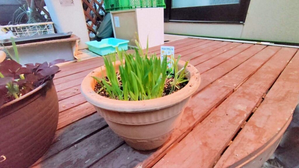 ウッドデッキで育ててるねこ草です。3匹の猫は全員これが好きですね。猫は植物も食べるのですね。