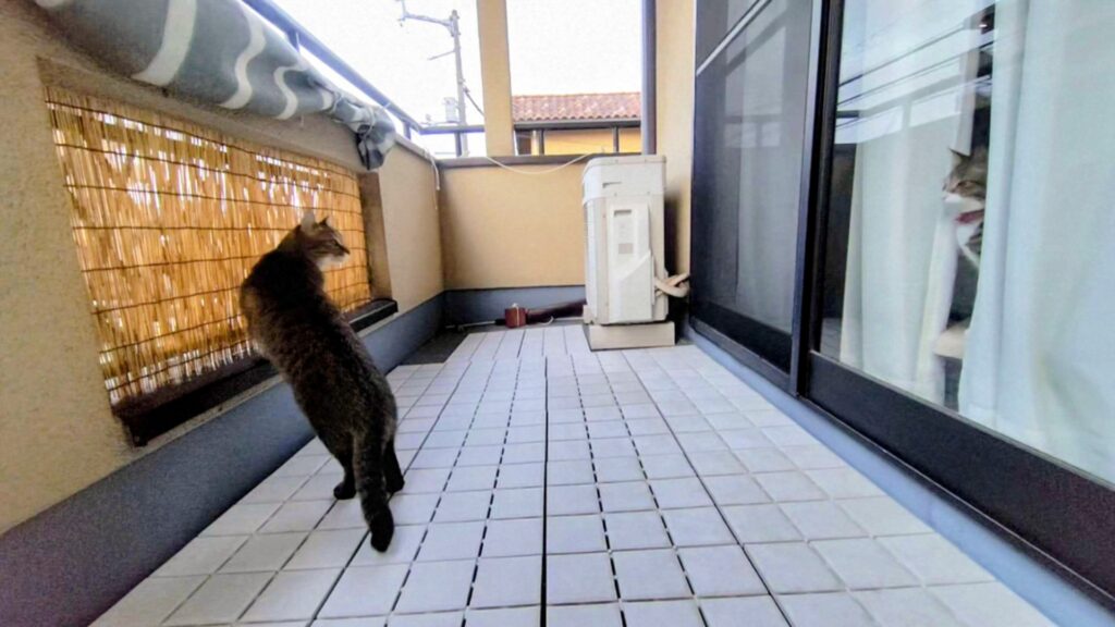 毎日一度は2階のベランダに出たがります。あずさとそらが過ごしやすいように、組合せタイルを敷いてます。新入り猫のうにはまだ出してません。