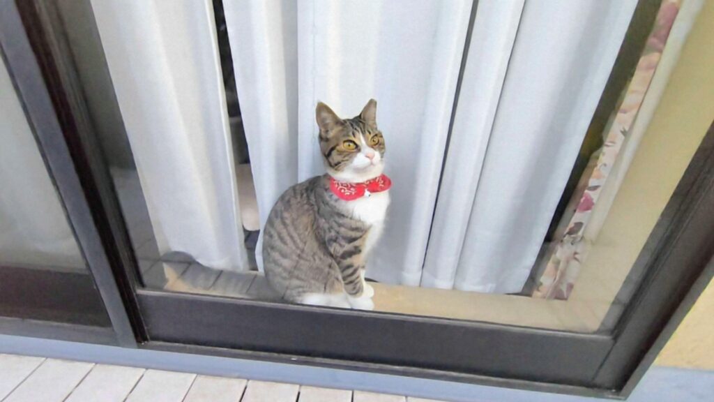 先輩猫が窓辺に来ると一緒についてきますが、ベランダから転落したり、カーポートへ飛び降りないか心配なので出してません。