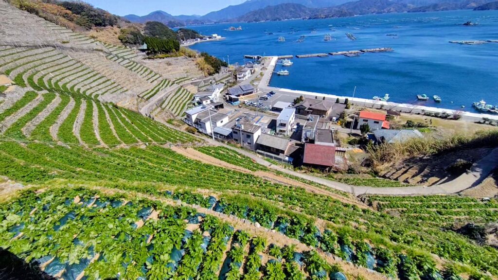 前回の宇和島の九島から旅の続きです。宇和海に面した斜面に石段を積み上げた壮大な段々畑。遊子水荷浦(ゆずみずがうら)の段畑。