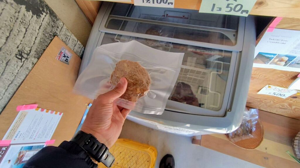 段畑を降りると無人販売の看板を見つけました。「じゃがじゃこ天」の文字が気になります。店に入るとアイスケースに冷凍のじゃこ天がありました。
