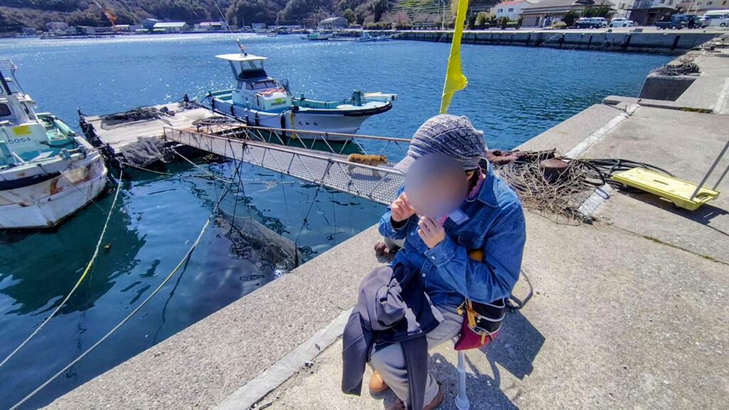 海辺に用意されたイスでじゃがじゃこ天を食べてると、筏から猫が上がって来ました。もしかしたら、いつも筏からじゃこ天を食べる人を見てるのかな…